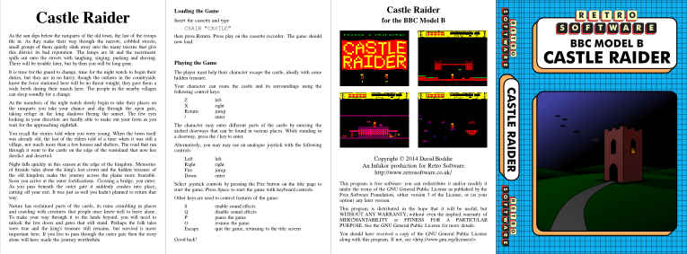 We're getting to the end of this development diary. I've moved Castle Raider to the Retro Software Releases page and added printable cassette inlays for the Electron and Beeb. The latter of these involved a lot of input from Arcadian, who really knows the Micro Power house style very well - that's the result of many years of collecting and preserving Acorn software for which many people are grateful.